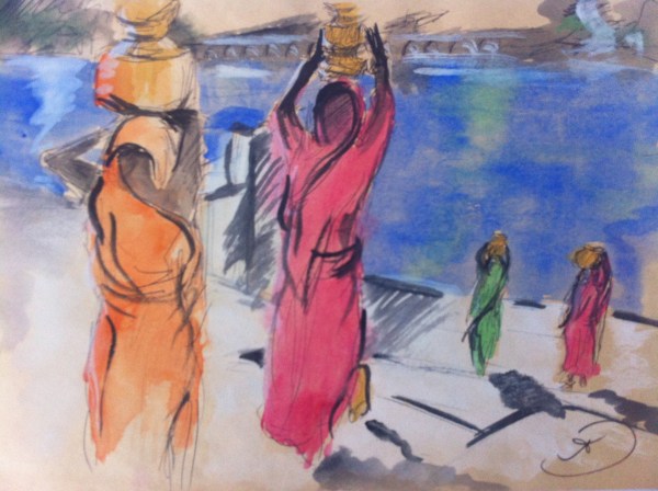 At sunrise every morning the people of Pushkah, in Rajasthan, India, and visiting pilgrims head down to the sacred Hindu site lake to bathe, wash or collect water. These women are carrying water from the lake up the 52 ghats, stone staircases, to the town.